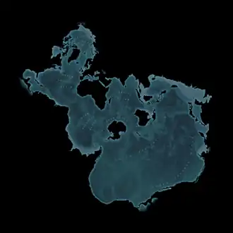 In 1942 Spilhaus tackled the problem of displaying the world's oceans in an unbroken view. He achieved this by carefully selecting antipodal points as the centers for two hemispheric projections.[12] However it wasn't until 1979 that he published maps using continental shorelines as "natural boundaries", including one that has become the typical example of Spilhaus's technique. It uses locations near Hankou in China and Córdoba in Argentina as poles with a cut joining them across the Bering Strait.[13] In 1991, Spilhaus published Atlas of the World illustrated with a large selection of maps having "geophysical boundaries", typically coastlines, in various orientations and for various purposes. He published several other papers and articles on the topic.[14] More recently, the Spilhaus Projection has been used to map multiple seafloor characteristics such as tectonic plate boundaries, hydrothermal vents, and drilling hole sites.[15]