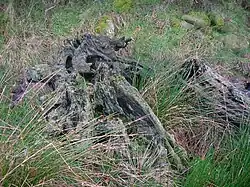 Dr. Duguid[25] visited Bonshaw, the home of the collector Alexander Reid, circa the 1840s and lists some of the items in Reid's collection, including garden seats made of bog-oak from Auchentiber Moss. In the 1840s during peat cutting at Auchentiber a straight row of wooden stakes was discovered under the peat, which was then between 10 and 12 feet thick.[26]