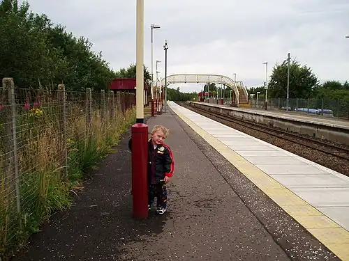 There are now no permanent buildings here apart from waiting shelters on each platform and the pedestrian footbridge.[3] Train running details are supplied via timetable posters, digital information screens, customer help points and automatic announcements. Step-free access is available to both platforms via ramps.[4]