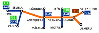 The Autovía A-92 is a highway in Andalusia, Spain. It is a major east–west route running south of the Sierra Nevada and is known as the Carretera Sevilla a Granada and Autovía de Andalucía.