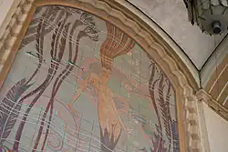 The theater's interior walls retain the original Art Deco murals by John Gabriel Beckman. The theater's entrance loggia, located between the two wings housing the ramps, feature nine mural panels of an Art Deco-style underwater world scene. In 1986, the center mural, depicting a mermaid, was restored using hand-painted tiles as originally envisioned. The restoration was with replications of Beckman's design created in Catalina Pottery-style tiles.[10] The lobby has walnut wood paneling.