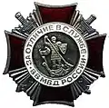 ![]() | Breast badge "For Distinction in Service of Interior Troops of Russia" 1st Class Нагрудный знак «За отличие в службе ВВ МВД России» I степени | No. 28 - No. 989 - No. 602 - No. 157 | 1995-01-27 --- 2012-10-31 --- 2013-08-06 --- 2016-04-05 | Awarded to military personnel of Internal Troops of Russia previously awarded the decoration "For Distinction in Service of Interior Troops of Russia" 2nd class, for initiative, diligence and distinction displayed during the performance of the tasks of maintaining public order, the protection of important state facilities and special cargoes; for active participation and distinction displayed in the line of duty in order to eliminate the consequences of accidents, fires, natural disasters and other emergencies; for high performance in combat training. May also be awarded to other citizens for the promotion of Russian Interior Troops and assistance in the performance of their tasks.[1][2][42] Decoration no longer exists following the dissolution of Internal troops and the creation of the Russian National Guard.[28] |