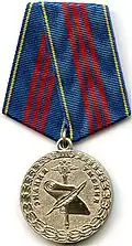 ![]() | Medal "For Military Cooperation" Медаль «За Боевое Содружество» | No. 50 - No. 989 - No. 602 - No. 220 | 2001-01-24 --- 2012-10-31 --- 2013-08-06 --- 2017-04-20 | Awarded to members of the Ministry of the Interior of the Russian Federation, the military forces of the Interior Ministry of Russia for services in strengthening the Brotherhood of Arms and military cooperation, and in some cases to other citizens of the Russian Federation or foreign citizens for assisting in the performance of the tasks assigned to the ministry.[1][2][6][4] |