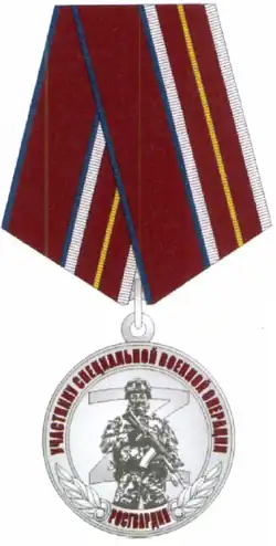 ![]()  |  Commemorative medal "For participant of the Special Military Operation"" Памятный медаль «Участнику специальной военной операции»"  |  № 170 | 2022-05-26 | By order of the Federal Service of the National Guard Troops of the Russian Federation dated May 26, 2022, No. 170, a commemorative medal "Participant in a Special Military Operation" was established; the document was registered by the Ministry of Justice of the Russian Federation and published on June 27, 2022. Therefore, it is awarded to:  "military personnel, persons serving in the troops of the National Guard of the Russian Federation and holding special police ranks, federal state civil servants and employees of the National Guard troops who took part in the Special Military Operation, for conscientious military service"; "persons who previously served in the military (service, carried out labor activities) in the troops of the National Guard, took part in the Special Military Operation, and were positively characterized in service"; "persons who distinguished themselves in providing assistance in the performance of tasks assigned to the troops of the National Guard during the Special Military Operation."  |