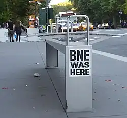 BNE is an anonymous graffiti artist known for stickers that read "BNE" or "BNE was here". The artist has left their mark in countries throughout the world, including the United States, Canada, Asia, Romania, Australia, Europe, and South America.[1] "His accent and knowledge of local artists suggest he is from New York."[2]