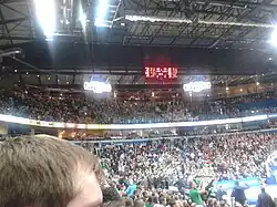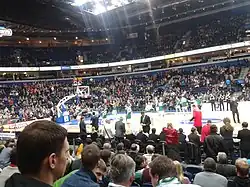 For the 2012–13 season, Žalgiris signed Lithuanian national team players Rimantas Kaukėnas, Darjuš Lavrinovič, and Kšyštof Lavrinovič; Unicaja Malaga star Tremmell Darden; and point guard Oliver Lafayette.[50][51][52] The season began with Žalgiris winning the newly established LKF SuperCup against Lietuvos Rytas. Early in the season, Mantas Kalnietis left the team and was replaced by Ibrahim Jaaber. Under new coach Joan Plaza, Žalgiris had their best EuroLeague start with five consecutive wins. They finished at the top of their group for the first time in 13 years, with an 8–2 record. In their 76–66 home victory against CSKA Moscow, Žalgiris broke their attendance record, with 15,812 spectators.[53] In January 2013, Jaaber departed from the team for personal reasons and was replaced by Donnie McGrath in February. In the coming months, financial troubles returned to the club, which led to the departure of Darden. The crisis coincided with the ongoing collapse of Ūkio Bankas. The bank's main shareholder Vladimir Romanov, who also owned the majority of shares of Žalgiris and was the club's president, abruptly left the country and flew to Russia in early March 2013, abandoning his stake in the club. On 20 March 2013, vice president Paulius Motiejūnas was named the team director. Despite the financial and management struggles, Žalgiris finished the Top-16 phase with a 6–8 record, the best in club history, but narrowly missed the playoffs. Žalgiris also won the group phase in the VTB United League. In May, Žalgiris won their third straight LKL title, sweeping Lietuvos Rytas 4–0 in the finals.[54] After winning the LKL title, Žalgiris competed in the VTB United League playoffs, defeating Nizhny Novgorod in the quarterfinals but losing to Lokomotiv Kuban in the semi-finals. Despite the loss, Žalgiris was awarded the bronze medal for the first time since 2010.[55]