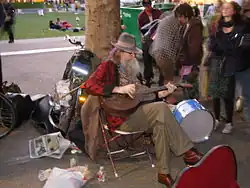 Baby Gramps plays a mixture of styles and eras including traditional blues, children's and labor songs, and his own compositions. His busy and unusual guitar style includes flat and finger picking, and "chording" with the back of his hand and his elbow. His singing styles include throat singing. His performance is based in part on improvisation and he often encourages audience participation. Baby Gramps has performed as a street musician, and has toured with Artis the Spoonman, Béla Fleck and the Flecktones and Phish. His rendition of "The Teddy Bears' Picnic" was featured in Martin Bell's Academy Award-nominated documentary film, Streetwise.