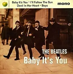 The British rock band the Beatles performed "Baby It's You" as part of their stage act from 1961 until 1963, and recorded it on February 11, 1963, for their first album, Please Please Me, along with "Boys", another song by the Shirelles.[7] The American label Vee-Jay Records included it on Introducing... The Beatles and Songs, Pictures and Stories of the Fabulous Beatles. Capitol included it on The Early Beatles. The Beatles' version differs from the Shirelles' in that it repeats the second verse instead of the first.[8]