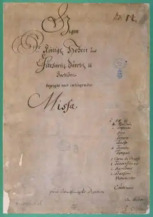 A different translation of this polite understatement[12] is "an insignificant product of the skill I have attained in music."[13] In the note, Bach also complained that he had "innocently suffered one injury or another" in Leipzig.[14] Petitions to the new ruler after the death of the previous one, as the one sent by Bach, were not exceptional in nature: similar petitions by musicians to August III included those of Jan Dismas Zelenka (unsuccessfully competing with Johann Adolph Hasse for the post of Kapellmeister),[15] Johann Joachim Quantz and Pantaleon Hebenstreit (a Lutheran court church director).[16] What was exceptional was that Bach accompanied his petition with a composition of considerable dimensions — a liturgical composition, no less — which was surprising in that Bach was then employed as a Lutheran church composer and was here presenting a work for the Catholic liturgy.