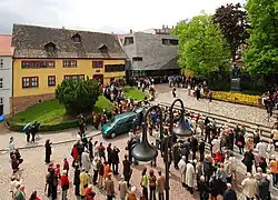 The historical Bach House is one of the oldest residential buildings in Eisenach. It originally consisted of two buildings, of which the eastern part was built in 1456 and the western part in 1458. At around 1611, both were joined.[10] As was normal with the Ackerbürgerhäuser (burghers' houses) of that time, the ground floor was used for agricultural purposes: today's instrument hall may have been used as a barn, and the rooms next to the stairs for cattle and horses.[11] In the museum, a cowbell from 1688 found in the Bach House garden reminds of this past. In the first floor of the building, a Renaissance glass window frame and the timber panelling of the living room now decorated as Composing Studio still bear witness of the citizen status of the house's former occupants. At the time of Bach's birth it was owned by Heinrich Börstelmann, headmaster of the Latin School. In 1746, the family of Caroline Amalie Rausch née Bach moved into the building and lived there until 1779. Caroline Amalie was the daughter of Bach's second cousin and friend Johann Bernhard Bach and sister to Johann Ernst Bach, a student of Bach at Leipzig and then court music director at Eisenach.[12]