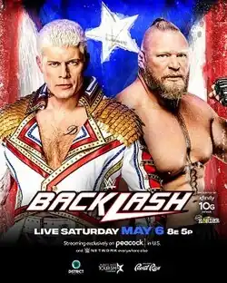 In the main event of Night 2 of WrestleMania 39, Roman Reigns defeated Cody Rhodes to retain the Undisputed WWE Universal Championship after interference from Paul Heyman and Solo Sikoa.[18] On the following Raw, Rhodes challenged Reigns to a rematch, however, Reigns declined. Rhodes then challenged Reigns and Sikoa to a tag team match, which Reigns accepted on two conditions: Rhodes' partner was someone who competed at WrestleMania 39, and that person could not challenge Reigns for his titles as long as Reigns was champion. Brock Lesnar answered, with the latter stipulation not applying to him due to the stipulation of his match with Reigns at the 2022 SummerSlam. However, the match never occurred due to Lesnar viciously assaulting Rhodes before the match could begin.[15] It was later reported that Lesnar was irate due to his position on the WrestleMania card, as his match had opened Night 2 instead of the main event slot. Rhodes addressed the attack on the following Raw and challenged Lesnar to a match at Backlash.[19] The following week, Rhodes appeared ready to fight, however, Rhodes was deemed unable to compete by medical personnel. To keep Rhodes from fighting Lesnar that night, WWE official Adam Pearce made the match for Backlash official.[20]