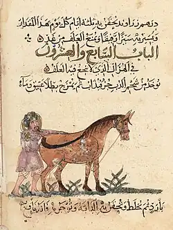 Actually, the Kitab al-baytarah is the only manuscript whose place of production is securely attributed to Baghdad and dated to 1209 through its colophon, which makes it a key work in trying to define a "Baghdad school" of illustrated manuscripts during the pre-Mongol period (the Mongol Siege of Baghdad dates to 1258).[3] The 1209 edition mentioning Baghdad is in the Egyptian National Library and Archives (Khalil Agha F8). The other, dated 1210, does not mention Baghdad, but is considered a copy of the 1209 edition, and was made by the same calligrapher.[11]