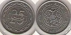 | 25 fils | 20 | 3.50 | Cupronickel | Reeded | Dilmun seal; Lettering (English and Arabic): State of Bahrain (until 2002); Kingdom of Bahrain (from 2002); Year of issue (Hijri and Gregorian) | 1992 | ||||||