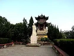 In 846, Bai Juyi died, leaving instructions for a simple burial in a grave at the monastery, with a plain style funeral, and to not have a posthumous title conferred upon him.[16] He has a tomb monument in Longmen, situated on Xiangshan across the Yi River from the Longmen cave temples in the vicinity of Luoyang, Henan. It is a circular mound of earth 4 metres (13 ft) high and 52 metres (171 ft) in circumference, with a 2.8-metre (9 ft 2 in) tall monument inscribed "Bai Juyi".