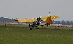 The Dragonfly was developed in the late 1980s specifically as a hang glider tug for use in flatland areas where hang glider flying, which usually relies on hill launches, was not possible. This role requires an aircraft that can climb quickly at low speed. The Dragonfly achieves this goal, with a power-off stall speed of 17 kn (31 km/h) by using a large area wing of 170 square feet (16 m2) in conjunction with Junkers-style flaperons. The takeoff distance required to clear a 49 ft (15 m) high obstacle is 492 ft (150 m) while flying solo and 984 ft (300 m) at maximum weight, on level short dry grass with no wind at 59 °F (15 °C).[10] The aircraft has been successful as a hang glider tug and is also used for livestock mustering in its home country, as well as for recreational flying where STOL capabilities are required.[1][2][5][6][7][8][9][11]