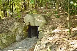 It is one of the few burial mounds in the Umami Kofun Group that has a horizontal entry burial chamber. The identity of the buried person is uncertain, but from the size of the mound, the size of the burial chamber, and the abundance of grave goods the most likely theory is that this is the grave of Prince Osasakahikohito, eldest son of Emperor Bidatsu. Currently, the site has been developed as Bakuya Historical Site Park, and access to the burial chamber is restricted, but it is open to the public for a certain period of the year.[2] It is approximately three kilometers northeast of Kashiba Station on the JR West Wakayama Line.