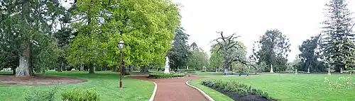 The gardens feature a large modern conservatory, returned Ex-POW war memorial, and the heritage statuary pavilion. The Stoddart Statue collection consists of 12 white marble figures from Italy donated by Thomas Stoddart in 1884. The 12 statues were figures from classical mythology: Spring, Summer, Autumn, Winter, Hercules, Pomona, Bacchante, Hebe, Flora Farnese, Leda, Mercury and Flora.[3] They were badly damaged by vandals in 2002 and were placed in the statuary pavilion after repair. The statues were returned to their original 1884 pedestals in March 2010.[4]