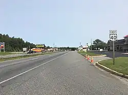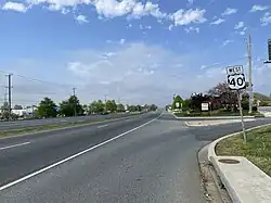 US 40 approaches the town of North East and heads into business areas, reaching an intersection with MD 272. It briefly passes through a sliver of North East as it passes more development before it curves east, crossing North East Creek and Little North East Creek in a wooded area. The road passes near a cluster of businesses near the Mechanics Valley Road junction and continues east through forested areas with some residential and commercial development. Farther east, US 40 reaches an intersection with the eastern terminus of the section of MD 7 passing through North East and the southern terminus of MD 279. Past this intersection, the route heads into the town of Elkton and curves east-southeast, passing over Little Elk Creek and Amtrak's Northeast Corridor in a wooded area. The road runs through commercial areas with some homes before it comes to a bridge over Big Elk Creek in woodland. US 40 heads into business areas, crossing MD 213 and curving east at the White Hall Road intersection. The route turns to the north-northeast and passes commercial development with some woodland, coming to a junction with the eastern terminus of a section of MD 7 that leads into the center of Elkton. US 40 heads through business areas and intersects the southern terminus of MD 781 before it reaches the Delaware state line, where US 40 continues into that state along Pulaski Highway.[1][3]