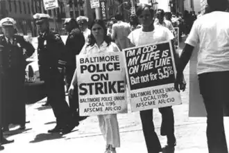 By 1973, about 2,000 of Baltimore's 3,500 police officers claimed membership in Local 1195. AFSCME leaders and representatives from other public employee unions and organizations pressed the City of Baltimore for collective bargaining rights and higher wages.[12] Some of the officers had worked previously at Bethlehem Steel and been on strike before.[13]