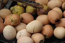 ![]() Balut eggs, one of which is partially shelled—showing yolk, fetus, and veins running through it. | |