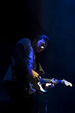 ![]() Bamboo during a live performance. From left: Bassist Nathan Azarcon, vocalist Bamboo Mañalac, and drummer Vic Mercado. | |