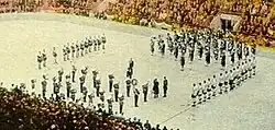 On 1 July 1867, the band presented a formal concert in Queen's Park, Toronto, in celebration of Confederation of Canada. Under Lieutenant Walter M. Murdoch's leadership, the band was increased to 60. The band played at Massey Hall throughout the 1930s, first at the opening ceremony of Maple Leaf Gardens in 1933 and the for the 100th anniversary of Toronto's incorporation in 1934.[3] It also took part in the reception for King George VI during his 1939 royal tour of Canada and has played for every reigning monarch from Queen Victoria to Elizabeth II throughout its history.[4]
