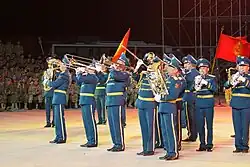 ![]() The band (led by Captain Jumatay uulu Dastan in the white tunic) during a 2015 victory day parade on Ala-Too Square. | |