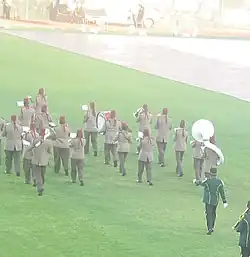 The main responsibility for military bands in the SANDF is to provide musical support to the South African Army, as well as indirectly foster high morale and pride. The bands of the SANDF provide musical accompaniment for official ceremonies such as the Armed Forces Day parade and the swearing-in of the President of South Africa.[3] Bands also perform for heads of State and government, most notably the Elizabeth II, President Bill Clinton, Colonel Muammar Gaddafi and Prime Minister Tony Blair and President Vladimir Putin. Educational requirements include musical knowledge, as well as basic infantry training. The members of these band regularly make visits to foreign countries as well as host other bands and musical groups in South Africa.[4]