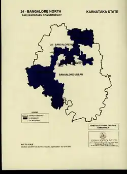 Bangalore North Lok Sabha constituency is one of the 28 Lok Sabha (lower house of the Indian Parliament) constituencies in the South Indian state of Karnataka. This constituency has been known by different names in its history. For the 1951 and every election since 1977 it has been known as Bangalore North. For the 1957 and 1962 elections it was known as Bangalore City. For the 1967 and 1971 elections it formed a constituency jointly with Bangalore South and was known as Bangalore. From 1951–73, this constituency resided in Mysore State. On 1 November 1973, Mysuru State was renamed as Karnataka.[2]