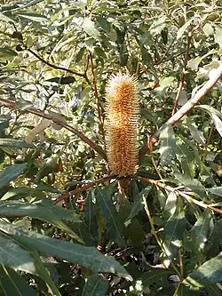 The bark and foliage is rough and covered in multiplication signs, although the new growth is covered in fine hair. The stems are generally less than 2 cm (0.79 in) in diameter,[3] and may be red or yellow when young.[6] The leaves are alternate or whorled along the stems, and spear- to egg-shaped (lanceolate to obovate) in shape. They measure 4–13 cm (1.6–5.1 in) long and 1–3 cm (0.39–1.18 in) wide. The leaf margins are entire or have occasional serrations. The leaf undersurface is white, with a midrib.[3] Flowering occurs over autumn and winter (April to July) and the flower spikes, known as inflorescences, arise from stems that are three or more years old. Cylindrical in shape, they are composed of a central woody spike or axis from which a large number of compact floral units arise perpendicularly to it, and are generally 3.2–4 cm (1.3–1.6 in) wide and 7–13 cm (2.8–5.1 in) high.[3] The individual flowers are more openly spaced than those of other banksias, and this is especially evident in late bud.[6] This, coupled with the tall thin shape of the flower spike, makes the species quite distinctive.[3] The flower spikes are pale- to golden brown in bud, and open to a more gold colour after anthesis.[6] Variations are seen, one form having a grey limb in bud, and plants with particularly tall flower spikes have been recorded near Huskisson at Jervis Bay.[7] As with most banksias, in anthesis the opening of the individual buds proceeds up the flower spike from the base to the top (acropetal).[3] The process from bud to the finishing of flowering takes six to eight weeks.[8]