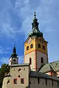 The oldest part of Banská Bystrica is town castle at the edge of SNP Square. It is enclosed within what has remained of its original fortifications − a barbican protecting the main gate, three bastions, and part of the walls. The town castle served as the town's administrative center and it also protected the king's treasury.[41] The Parish Church (Slovak: Farský kostol) of the Assumption of the Virgin Mary built in the Romanesque and Gothic styles contains precious Gothic altars and sculptures.[15] One of the altars was carved by the famous Master Paul of Levoča. The church was built in the 13th century. It is still surrounded by remnants of its ancient cemetery. The neighboring Church of the Holy Cross was built in 1452 by the Slovak burghers as a counterpart to the Church of the Virgin Mary that then acquired the attribute German.[41] The Matthias House (Slovak: Matejov dom) was built in 1479 as a five-story late-Gothic structure with a Gothic portal and stone console balcony. It served as a temporary residence of King Matthias Corvinus and his Queen Consort Beatrix. The Renaissance Old Town Hall, dated from 1500, has been transformed into an art museum.[42]