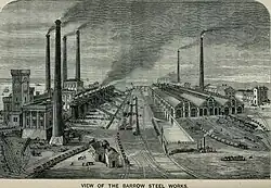 Iron prospector Henry Schneider arrived in Furness in 1839 and, with other investors, opened the Furness Railway in 1846 to transport iron ore and slate from local mines to the coast. In 1850 extensive hematite deposits were discovered of sufficient size to develop factories for smelting and exporting steel.[2] Schneider Hannay & Co. was founded in 1859 and was renamed the Barrow Hematite Steel Company in 1865. Officially registered on 1 April 1864, Sir James Ramsden acted as Managing Director and Josiah T. Smith became General Manager of the Barrow Hematite Steel Company. The Hindpool iron and steelworks were expanded to include ten blast furnaces and 18, 5-ton Bessemer converters by 1866, which were physically separated by the Furness Railway.[2]