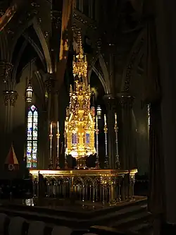 The basilica has three altars. The first is a high altar in Gothic Revival style, a graceful object in bronze built in shops of Froc-Robert in Paris for the Centennial Exposition in Philadelphia, during which it won a design award.[14] After the Exposition, Father Sorin purchased the piece for the church. The tabernacle tower, which holds the reserved Blessed Sacrament, was inspired by Revelation 21:9, the vision of the new Jerusalem. Following the Second Vatican Council the gothic altar was moved to the apse, and a new altar was placed in the transept. This altar, called the Altar of Sacrifice, was made from old pews and choir stalls from the Lady Chapel. The third altar is a baroque altar in the Lady Chapel believed to come from the studios of Giovanni Bernini in Rome. Next to the gothic altar there are the Umbraculum and the Tintinnabulum, which are adorned with the insignia of the Pope and the coat of arms of the basilica, the dioceses, and the congregation. These two objects are symbols of the designation of minor basilica. The baptismal font, which is located at the entrance of the church, dates from 1871.[14]