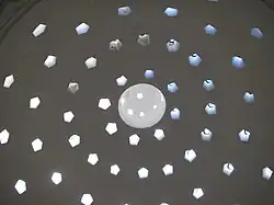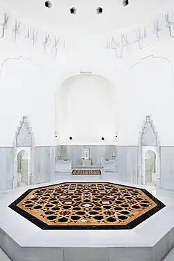 The men's changing room is rectangular and covered with a dome, which is surrounded by a frieze of zigzag-shaped leaves in the ablaq decorative technique. There are pointed-arch niches on each side of the room. There are toilets, roofed with three domes, on one side of the cool room, with a shaving room on the other side A door leads into the cross-shaped hot room, which has four loggias with fountains in the corners, and four self-contained cubicles for privacy (halvet) under a small dome. In the centre of the hot room is a large octagonal marble table called a göbektaşı (literally: navel stone), which bathers can lie on. It was formerly decorated with mosaics. The large dome of the hot room, which sits on the octagonal-shaped walls, has small glass windows to create a half-light from the top. The women's section has the same architectural plan as the men's side, although its changing room is slightly smaller.