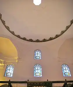 The exterior walls are built in courses of one cut stone and two bricks. The changing room of the men's section has four pointed-arch stained-glass windows above in the facade while the women's changing room has three windows.