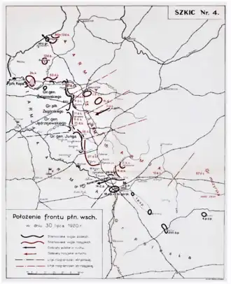 In the first days of July 1920, the Polish front on the Auta River was broken, and the troops of the Northeastern Front, Gen. Stanisław Sheptycki's forces were retreating under the pressure of Mikhail Tukhachevsky's offensive. The Supreme Command of the Polish Army ordered the troops of the Soviet Western Front to be stopped on the line of former German trenches from World War I.[1] The operational situation, especially the fall of Vilnius and the bypass of Polish positions from the north, forced the further retreat of Polish troops.[2] 1st Army of Gen. Gustaw Zygadłowicz retreated to the Niemen, and the 4th Army to Szczara, and the Polesie Group to the Ogiński Canal and Pinsk.[3] [4]