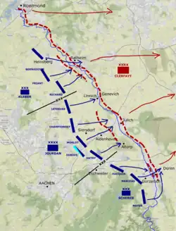 On 2 October, General Jourdan ordered the Army of Sambre-and-Meuse to force the line of the Roer river, and the 100,000 men of the army attacked on a front of nearly 60 miles from Roermond to Düren. The French were generally on the road through the morning of 2 October and only came into action near mid-day.[8]