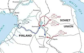 By conquering Northern Finland, the Soviet leadership wanted to occupy the entire Finnish state and cut off the traffic routes to its neighbors during the war.[2] In order to support the advance of the 163rd Rifle Division and 44th Motorized Rifle Division on Oulu, the 54th Rifle Division was to advance south to cut off any routes for reinforcements from the Finnish heartland.[3]