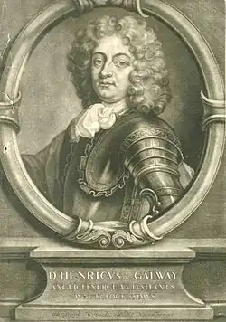 Of the 2,300 prisoners, the greater number, around 1,500, were Queen Anne's troops, and the remainder, or 800, were Portuguese.[2] The highest ranking British officers made prisoners, were Major-General James Barry, 4th Earl of Barrymore, Nicholas Sankey; Brigadier-General Thomas Pearce; the 2nd Colonel of the Regiment of Galway, with Major Thomas Gordon of that corps; Lieutenant-Colonel Henry Meredith of the Regiment of Colonel Thomas Stanwix, and Lord Henry Pawlet, Aide-de-Camp to the Earl of Galway; the latter nobleman, (unfortunate here as at Almansa,) after having a horse shot out from under him, only escaping with difficulty.[3]