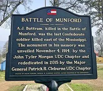Lieutenant Andrew Jackson Buttram was the last Confederate soldier to die in battle east of the Mississippi River,[16] at the Battle of Munford.[17]