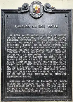 The Battle of San Mateo was a battle during the Philippine–American War between the United States and the Philippines. It was fought on December 19, 1899, near San Mateo in what was then Manila province (now a part of Rizal) between the forces of General Henry Ware Lawton, and General Licerio Gerónimo's Morong Command and a detachment of Tiradores de la Muerte.[2] Lawton was killed in the battle, making him the highest-ranking American commander to die in the Philippine conflict.[3]