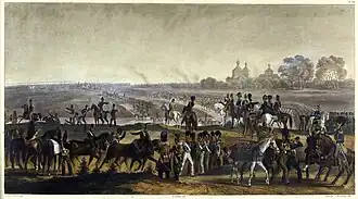 Barclay had left Generalmajor Neverovski's 27th Division to guard Krasnoy, along with some cavalry and artillery. This force of 5,500–7,200 infantry, 1,500 cavalry and 10–14 guns was attacked by 20,000 Frenchmen under Murat and Marshal Michel Ney beginning around 2:30 PM on 14 August. Murat's and Ney's inability to coordinate their infantry-cavalry operations allowed the Russians to get away, at the cost of 1,500–2,300 Russian men and seven guns as well as 500 French casualties. The French had multiple excellent chances in the First Battle of Krasnoi to annihilate the Russians but failed to do so. Neverovski retreated into Smolensk, shutting the gates behind him. The French inability to capture the city on the fly imposed a disastrous delay on their operations.[12] Neverovski requested reinforcements from Bagration and received Nikolai Raevsky's VII Corps, which arrived on the morning of 15 August to defend the southern bank of the Dnieper near Smolensk.[17][18]