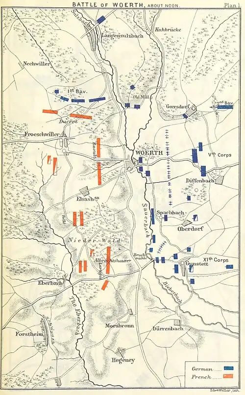 In the center, the fight had been going badly for the V corps. As soon as the 84 guns between Dieffenbach and Spachbach opened fire, the French disappeared from sight. There was no longer a target, and, perhaps to compel his adversary to show himself, von Kirchbach ordered four battalions to cross the river. These battalions, however, were widely separated and came under fire as soon as they appeared. They attacked in two groups, one from Wœrth towards Frœschwiller, the other from near Spachbach towards the Calvary spur, east of Elsasshausen.[3] Both were overpowered by French infantry fire. A fraction of the southern party maintained itself all day in the elbow of the Hagenau Chaussee, which formed a starting point for subsequent attacks. But the rest were driven back in great confusion. Once more the dashing counter-attack of the French was thrown into confusion by Prussian shell fire, and as the French fell back, the Prussian infantry, now reinforced, followed them up (about 13:00 h). The commander in chief of the German Third Army (Crown Prince Frederick William) now appeared on the field and ordered Kirchbach to stand fast until the pressure of the XI corps and of the Württemberg division could take effect against the French right-wing. The majority of these troops had not yet reached the field. Von Bose, however, seeing the retreat of the troops of the V Corps, had independently determined to renew the attack against the Niederwald with much of his forces as had arrived, and had ordered General von Schkopp's brigade, which was then approaching, to join the troops collecting to the east of Gunstett. Schkopp, however, seeing that his present line of advance led him directly onto the French right about Morsbronn and kept him clear of the confusion to be seen around Gunstett, disregarded the order and continued to advance on Morsbronn. This deliberate acceptance of responsibility really decided the battle, for Schkopp's brigade quietly deployed as a unit and compelled the French right-wing to fall back.[4]