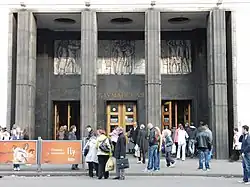 Baumanskaya (Russian: Бауманскаяpronunciationⓘ) is a station on the Arbatsko-Pokrovskaya Line of the Moscow Metro, named after the revolutionary Nikolai Bauman. It was designed by Boris Iofan and Yury Zenkevich and opened in 1944. The Art Deco design features white marble pylons with rounded corners, projecting, fluted piers faced with red ceramic tile, and decorative ventilation grilles. In the bays between each set of piers are bronze sculptures by V.A. Andreev depicting Russian soldiers and workers of the home front during World War II. At the end of the platform is a mosaic portrait of Vladimir Lenin. This station is very busy, as one of the biggest Moscow institutes (Moscow State Technical University) is located not far away.