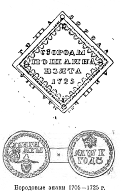 The 1699 and 1705 versions were inscribed with the words "money taken" (ДЕНГИ ВЗѦТЫ) on the obverse, and the date in Cyrillic numerals (҂АѰЕ ГОДѸ, "Year 1705") on the reverse of the 1705 token; the 1710 version was largely the same with an updated date (҂АѰІ, "1710"). The rhomboid version of 1724/1725 was smooth on the reverse with the phrase "beard tax taken" (СБОРОДЫ ПОШЛИНА ВЗЯТА) on the obverse and "the beard is a superfluous burden" (БОРОДА ЛИШЬНАѦ ТѦГОТА) on the edge. The date on the later tokens was written in Arabic numerals.[11][14][15]