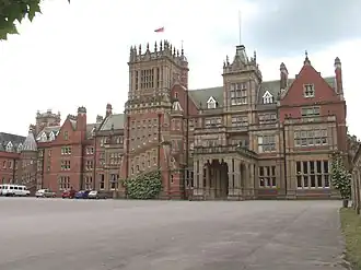 The school chapel was constructed in 1934–1935 and was designed by Herbert Baker. Funding came from the Inchcape family, in memory of the shipowner, James Mackay, 1st Earl of Inchcape, who was Chairman of the Merchant Seamans Fund.[25] Bearwood House is a Grade II* listed building,[23] and stands in parkland with its own Grade II* listing.[26] Many of the estate buildings have independent listings, including the main lodge,[27] the Oak Lodge,[28] and the school's chapel.[29] Nikolaus Pevsner, in his Buildings of England, describes Bearwood as "in its brazen way, one of the major Victorian monuments of England".[30]