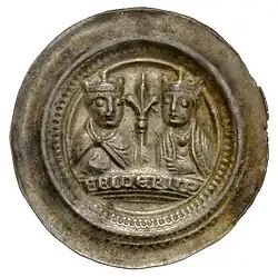 Materials recording Beatrice's political activities are relatively scarce, especially in comparison with those of the Ottonian and Salian empresses and queens. Nevertheless, recent research shows that the empress's role in the contemporary political life was much more important than previously estimated. This is partly demonstrated through the efforts of contemporaries to influence the emperor's decisions through the empress. For example, when Barbarossa refused to listen to Milan's appeal for mercy in 1162, the city turned to Beatrice.[18] She tended to intervene on behalf of people personally connected to her, as well as churches, monasteries, hospitals. Her status as Barbarossa's trusted political partner was also shown in various contemporary representations, including on coins.[19][20][21]