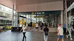 It is a two-story elevated station with a ticketing office on the ground floor and an island platform on the elevated floor.[6] It has three underground exits primarily serving the Bedok Mall, Bedok Bus Interchange and the eponymous hawker centre, Heartbeat@Bedok, and Bedok Point.[24] It has been described as one of the busiest stations on the Eastern portion of the EWL.[9][25] During its opening day, 17,614 people entered the station before 20:00 Singapore Standard Time (UTC+08:00).[26]