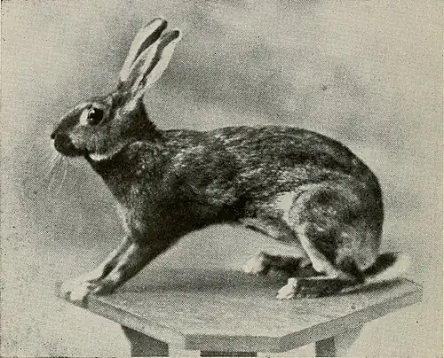 The Belgian Hare is a "fancy" (i.e., it is primarily for exhibition, not meat, fur or fiber) breed of domestic rabbit. It has been selectively bred to resemble the wild European hare,[1] but nevertheless, it is a rabbit rather than a true hare. Averaging 6–9 pounds (2.7–4.1 kg), the Belgian Hare is known for its slender and wiry frame and its long and powerful legs. The breed is responsible for launching the domestic rabbit industry, as well as popularizing rabbit shows in the United States.[2]