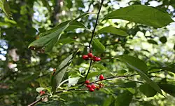 Many animals feed on the leaves, twigs, and berries of spicebush. Some mammals include whitetail deer, Eastern cottontail rabbit, opossums.[7][8] Over 20 species of birds including both gamebirds and song birds such as ring-necked pheasant, bobwhite, ruffed grouse and others have been known to feed on spicebush.[7][8] The berries are a favorite food of wood thrushes.[7]